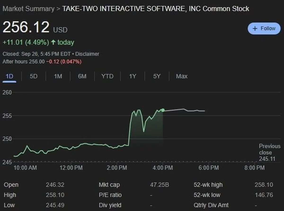Для сравнения — 6 мая, когда Rockstar Games представила второй трейлер Grand Theft Auto VI, цена акции составляла 231,84 доллара. С чем связан всплеск интереса инвесторов сейчас — не совсем понятно.