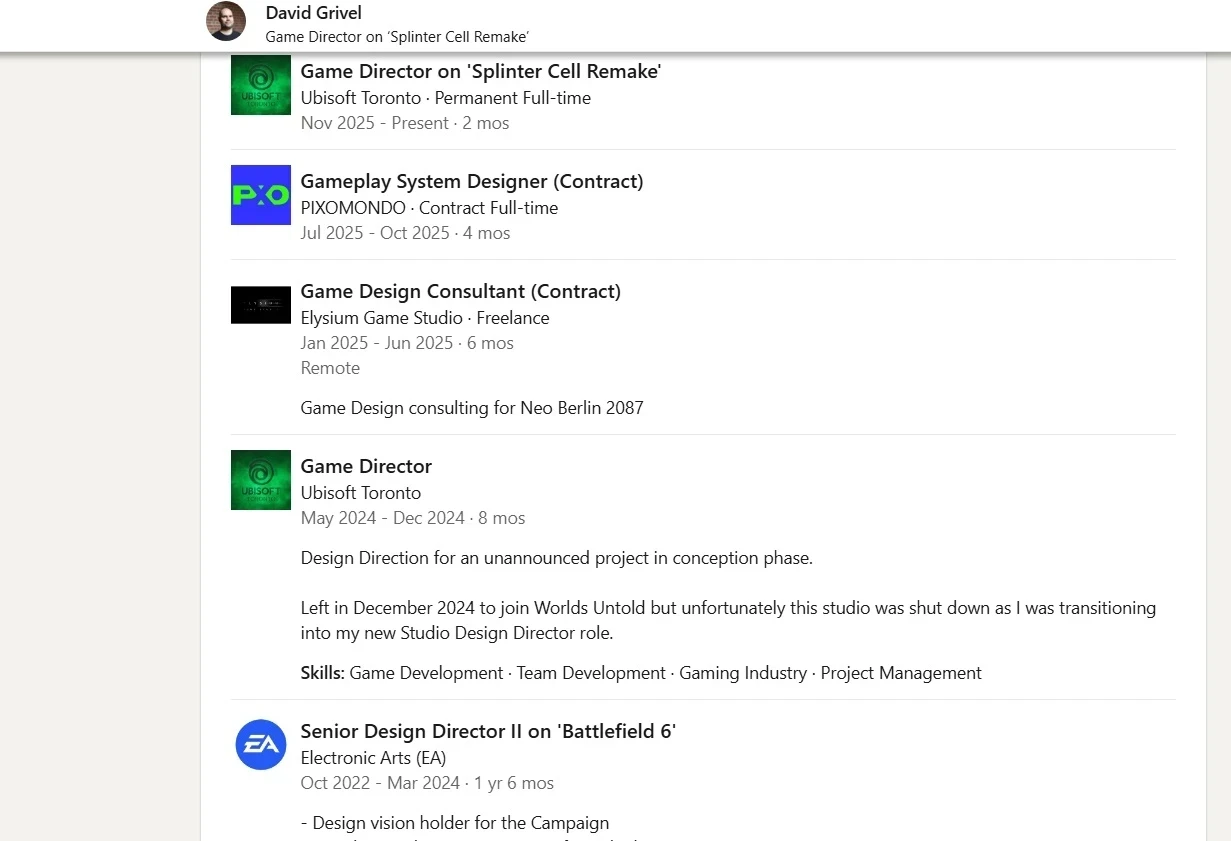 Кстати, сам Гривел после ухода из Ubisoft в октябре 2022 года устроился в Electronic Arts. До марта 2024 года он проработал над Battlefield 6 на позиции старшего содиректора по дизайну.