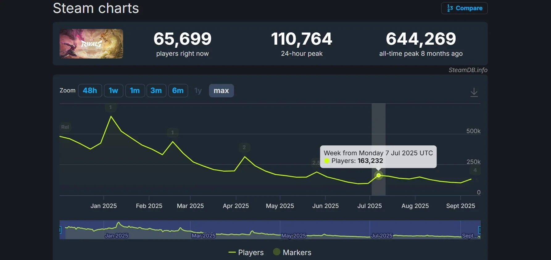 В момент старта первого сезона в январе этого года пиковый онлайн Marvel Rivals превысил 644 тысячи человек. С тех пор значение постепенно снижалось: старт второго сезона привлёк 315 тысяч человек, тогда как в июле с третьим сезоном пришло познакомиться лишь 163 тысячи человек. Между сезонами суточный пиковый онлайн также не превышает показатели первых дней с момента начала сезонов.