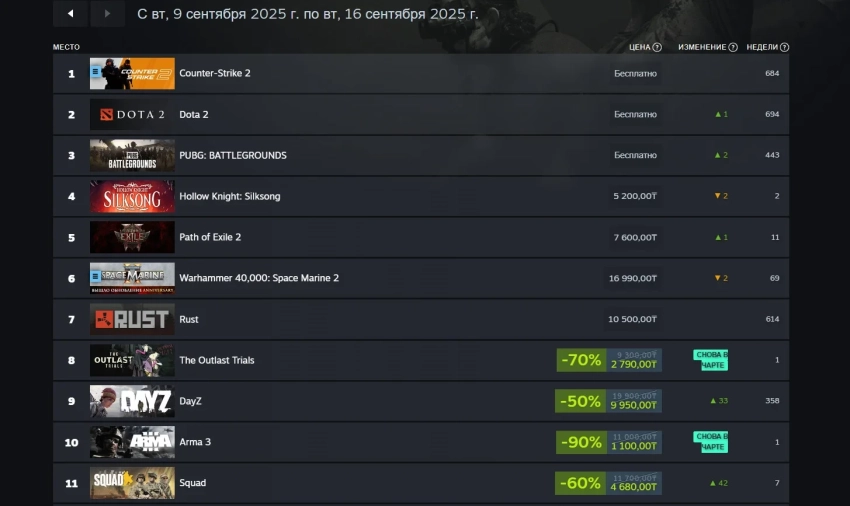 Чарт продаж Steam с 9 по 16 сентября 2025 года