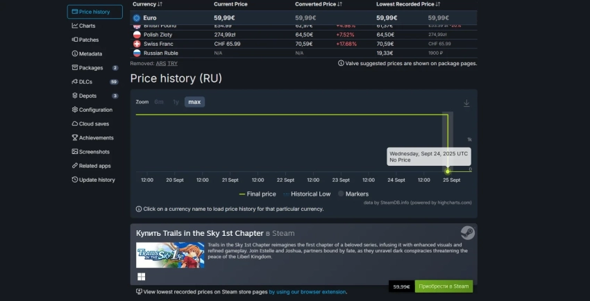 После выхода Trails in the Sky 1st Chapter игроки призывали вводить региональные цены, в том числе в странах СНГ. Теперь в социальных сетях предполагают, что именно эти призывы привели к пропаже игры из российского Steam. Стоимость Trails in the Sky 1st Chapter в России составляла 1900 рублей. Кроме того, за дополнительную плату можно было получить косметические предметы.